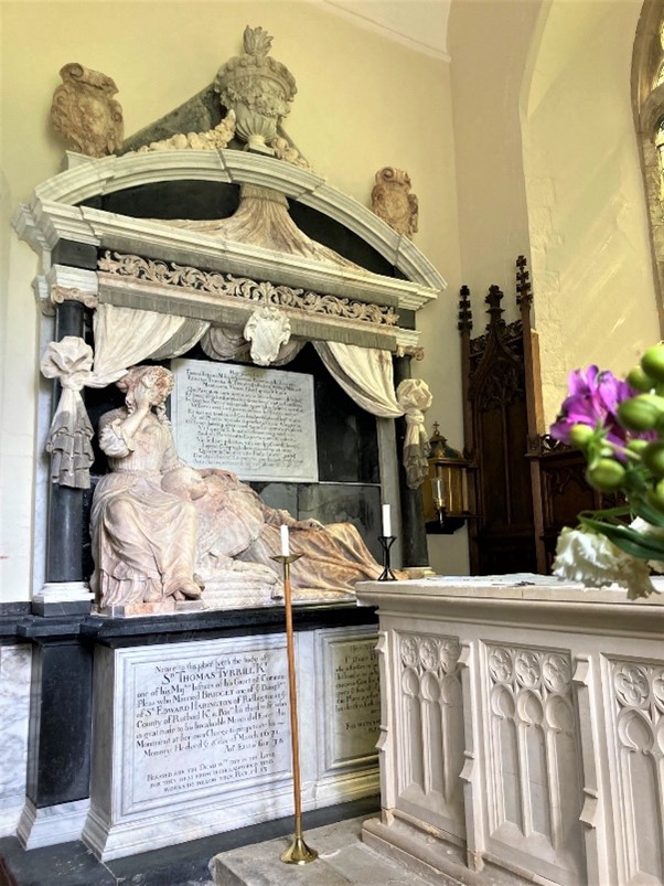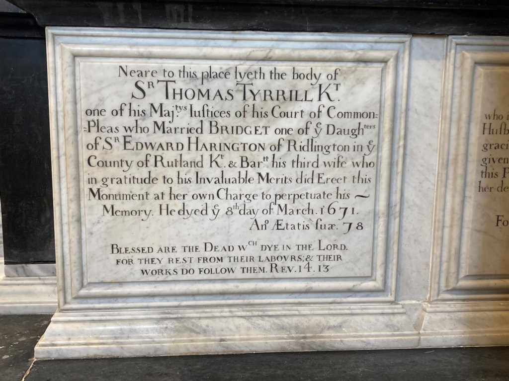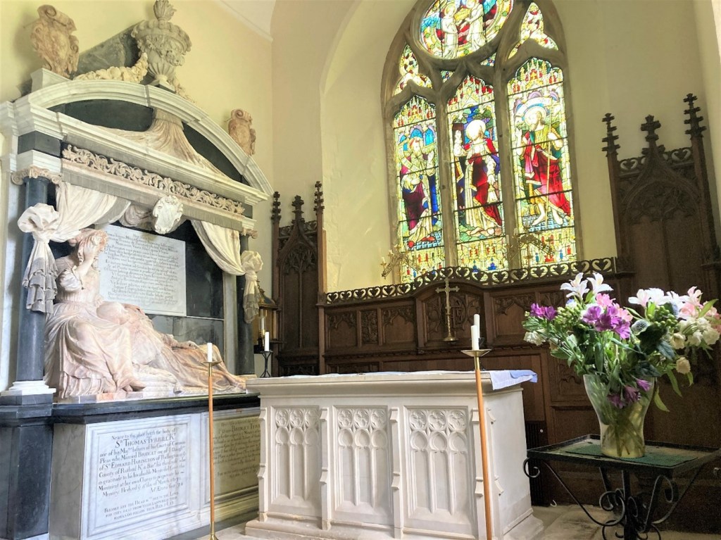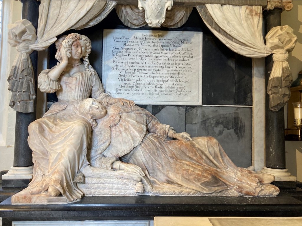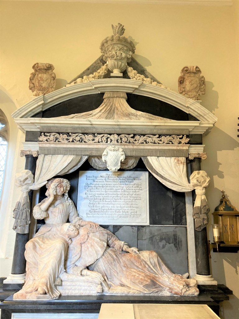 This impressive monument next to the altar was erected by Dame Bridget Tyrrill, Sir Thomas’ third wife, after his death in 1671. It’s said to depict how Sir Thomas died, sitting with his wife in the window seat of their home, slumping gentle sideways on cushions.
