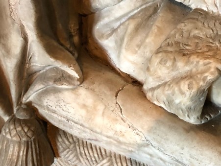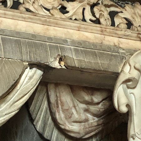 These photos show some of the stains, fallen decorative features and numerous open joints. This work was the first since the monument was erected in the 1670s, apart from minor plaster fill and (sometimes crude) repairs.